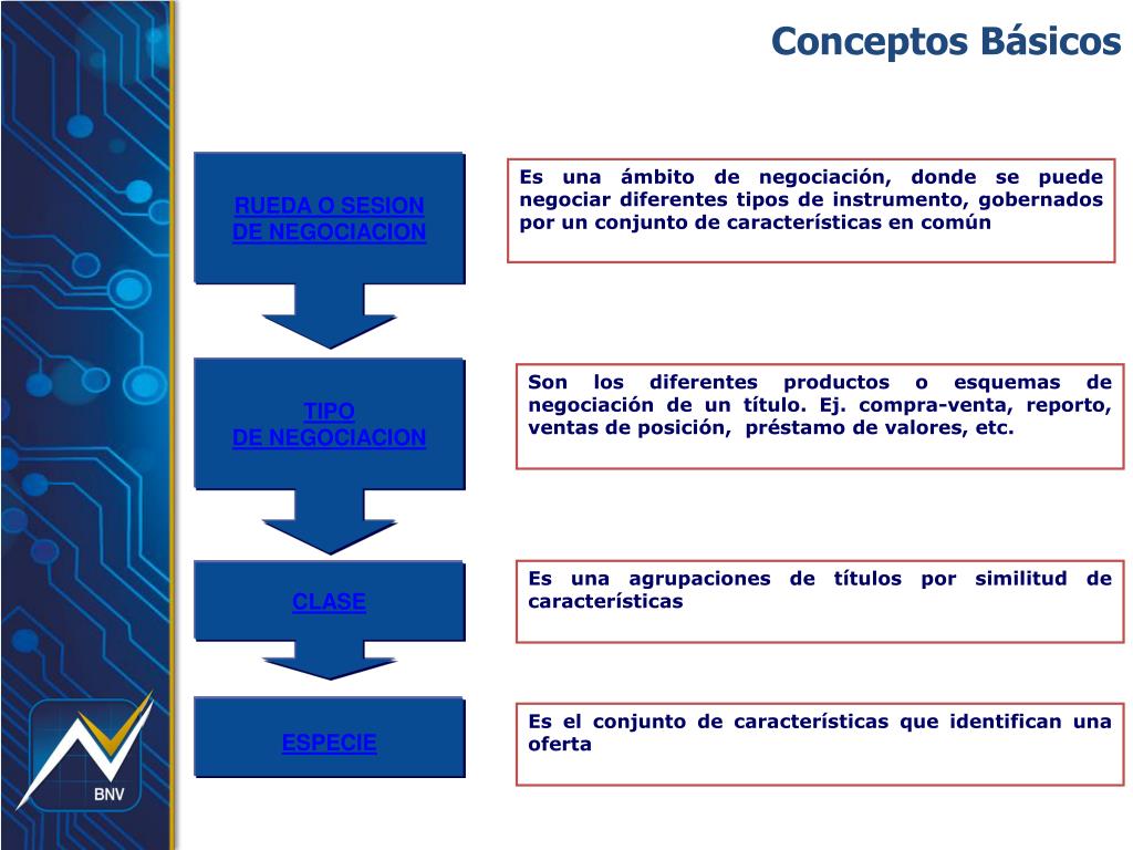Conceptos Básicos ESPECIE TITULO ASOCIADO MONEDA CLASE TIPO OPERACION PLAZO ENTE LIQUIDADOR • Tipo de operación: compra venta a hoy, a plazo, títulos líquidos, compra venta acciones, reporto, etc. • Clase: Agrupación de títulos por similitud de características. • Ente liquidador: Entidad donde se liquida la operación. • Título: Activo que se desea ofertar. • Plazo: Son los días pactados para la liquidación. • Moneda: Moneda en la que se liquida la operación.