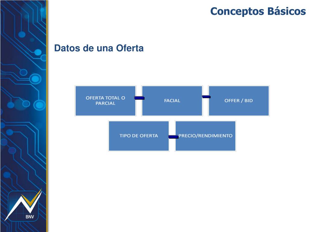 Conceptos Básicos • Tipos de Oferta • GTC - Good to Cancel. La oferta permanece en la rueda hasta que sea calzada. • GTD - Good to Date. La oferta permanece hasta que se cumpla el plazo de vencimiento. • IOC - Inmediate or Cancel. Una vez ingresada se verifica si tiene condición de cierre, si es así cierra una operación, sino la oferta es eliminada inmediatamente. • FOK - Fill or Kill. Igual que la anterior pero con la diferencia que esta debe cerrar por el monto total.