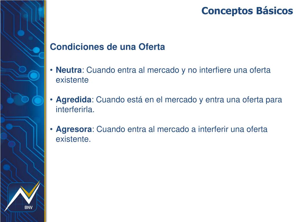 Conceptos Básicos • Condiciones de una Oferta • Neutra: Cuando entra al mercado y no interfiere una oferta existente • Agredida: Cuando está en el mercado y entra una oferta para interferirla. • Agresora: Cuando entra al mercado a interferir una oferta existente.