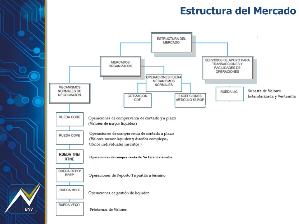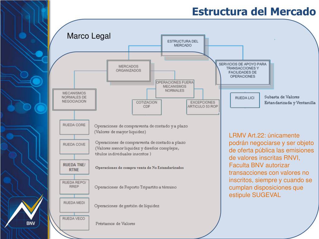 Estructura del Mercado Marco Legal LRMV Art.22: únicamente podrán negociarse y ser objeto de oferta pública las emisiones de valores inscritas RNVI, Faculta BNV autorizar transacciones con valores no inscritos, siempre y cuando se cumplan disposiciones que estipule SUGEVAL