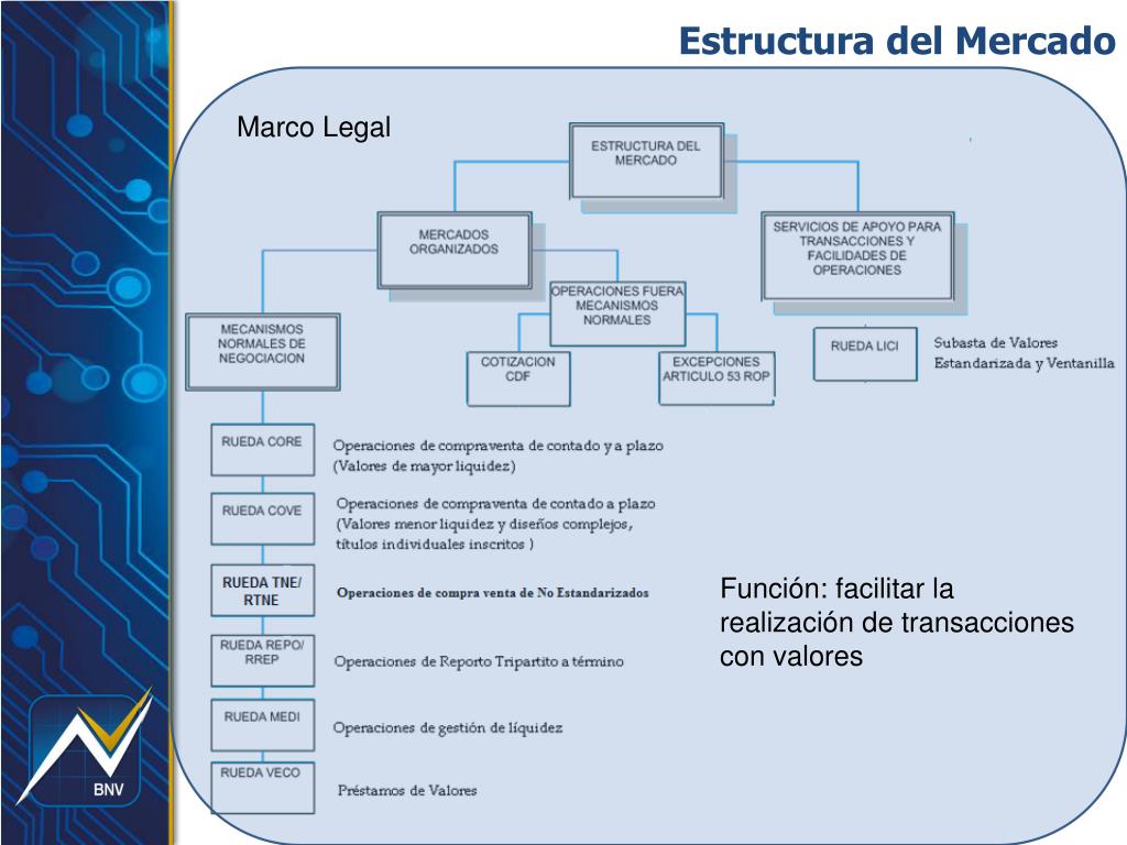 Estructura del Mercado Marco Legal Función: facilitar la realización de transacciones con valores