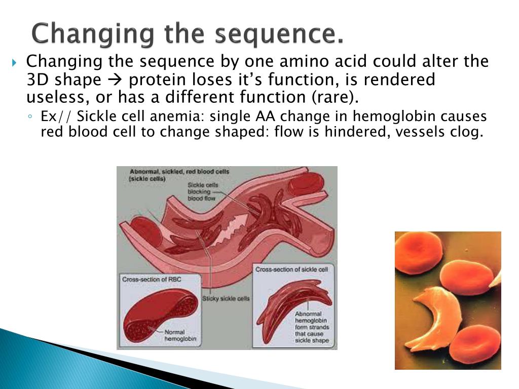 Changing the sequence. • Changing the sequence by one amino acid could alter the 3D shape protein loses it’s function, is rendered useless, or has a different function (rare). • Ex// Sickle cell anemia: single AA change in hemoglobin causes red blood cell to change shaped: flow is hindered, vessels clog.