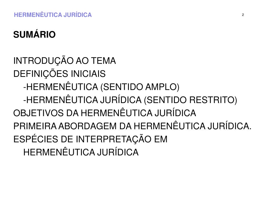 HERMENÊUTICA JURÍDICA 2 SUMÁRIO INTRODUÇÃO AO TEMA DEFINIÇÕES INICIAIS -HERMENÊUTICA (SENTIDO AMPLO) -HERMENÊUTICA JURÍDICA (SENTIDO RESTRITO) OBJETIVOS DA HERMENÊUTICA JURÍDICA PRIMEIRA ABORDAGEM DA HERMENÊUTICA JURÍDICA. ESPÉCIES DE INTERPRETAÇÃO EM HERMENÊUTICA JURÍDICA