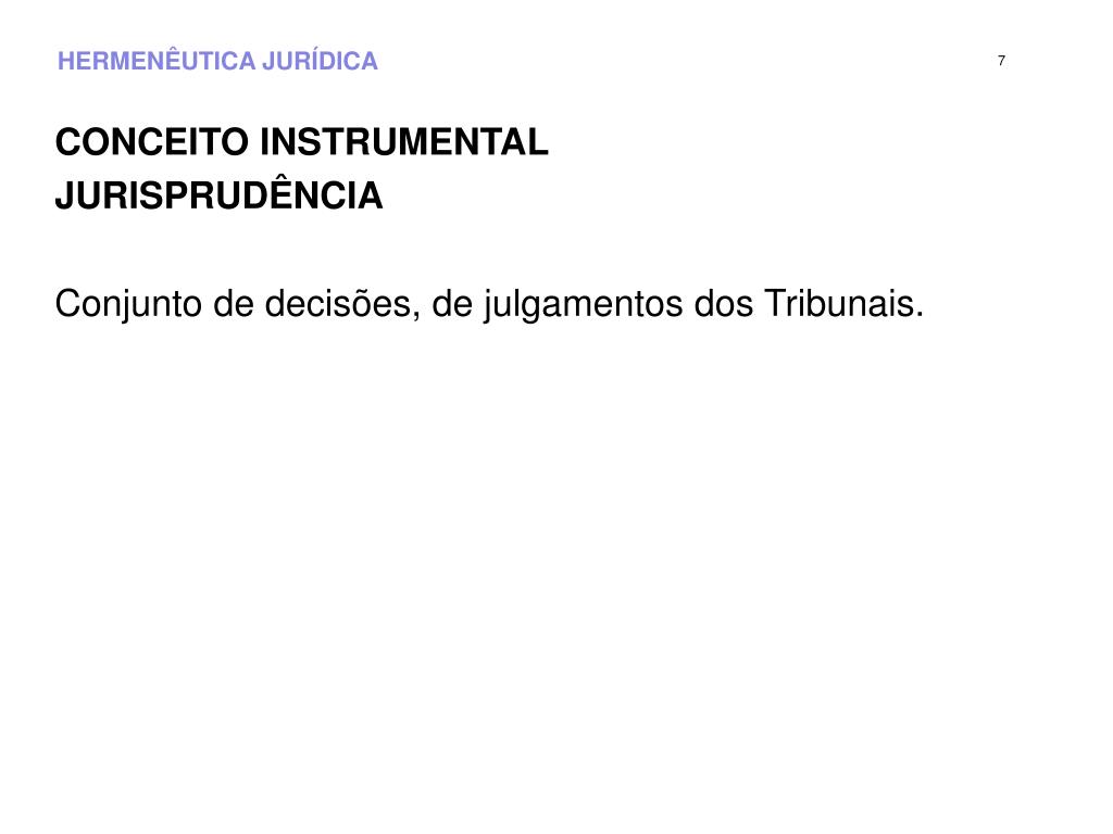 HERMENÊUTICA JURÍDICA 7 CONCEITO INSTRUMENTAL JURISPRUDÊNCIA Conjunto de decisões, de julgamentos dos Tribunais.
