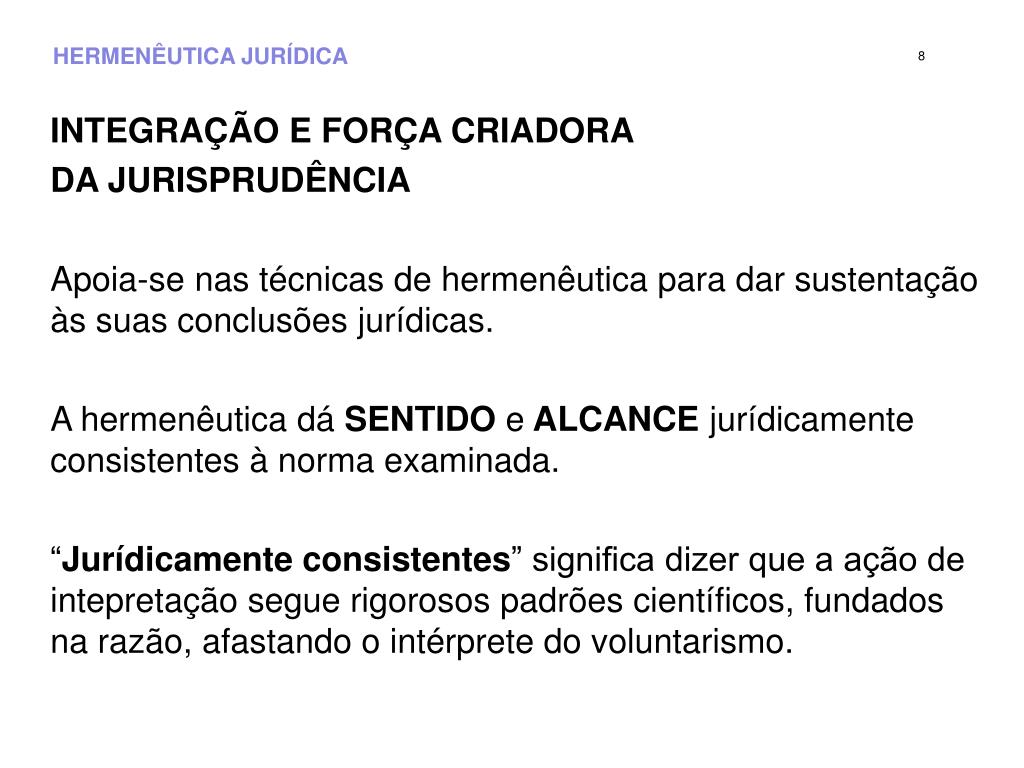 HERMENÊUTICA JURÍDICA 8 INTEGRAÇÃO E FORÇA CRIADORA DA JURISPRUDÊNCIA Apoia-se nas técnicas de hermenêutica para dar sustentação às suas conclusões jurídicas. A hermenêutica dá SENTIDO e ALCANCE jurídicamente consistentes à norma examinada. “Jurídicamente consistentes” significa dizer que a ação de intepretação segue rigorosos padrões científicos, fundados na razão, afastando o intérprete do voluntarismo.