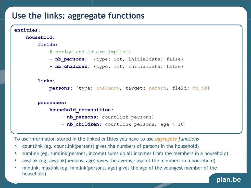 Use the links: aggregate functions entities: household: fields: # period and id are implicit - nb_persons: {type: int, initialdata: false} - nb_children: {type: int, initialdata: false} links: persons: {type: one2many, target: person, field: hh_id} processes: household_composition: - nb_persons: countlink(persons) - nb_children: countlink(persons, age < 18) To use information stored in the linked entities you have to use aggregate functions countlink (eg. countlink(persons) gives the numbers of persons in the household) sumlink (eg. sumlink(persons, income) sums up all incomes from the members in a household) avglink (eg. avglink(persons, age) gives the average age of the members in a household) minlink, maxlink (eg. minlink(persons, age) gives the age of the youngest member of the household)