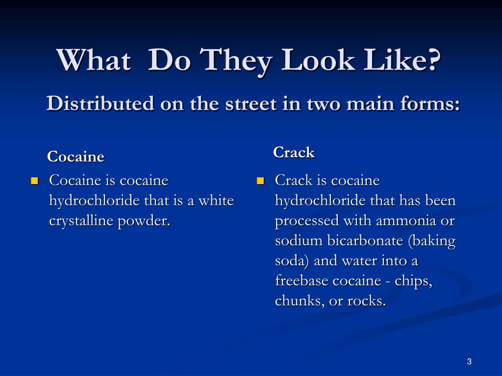 What Do They Look Like?Distributed on the street in two main forms: Cocaine Crack Crack is cocaine hydrochloride that has been processed with ammonia or sodium bicarbonate (baking soda) and water into a freebase cocaine - chips, chunks, or rocks. • Cocaine is cocaine hydrochloride that is a white crystalline powder.