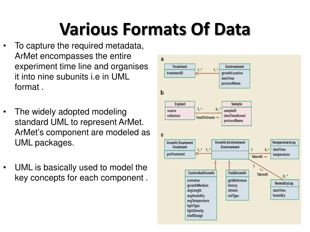 Various Formats Of Data • To capture the required metadata, ArMet encompasses the entire experiment time line and organises it into nine subunits i.e in UML format . • The widely adopted modeling standard UML to represent ArMet. ArMet’s component are modeled as UML packages. • UML is basically used to model the key concepts for each component .