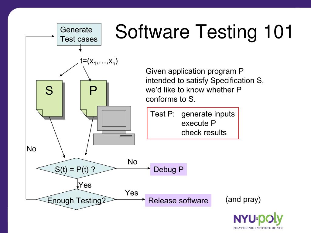 No No S(t) = P(t) ? Yes Yes Enough Testing? Software Testing 101 Generate Test cases t=(x1,…,xn) Given application program P intended to satisfy Specification S, we’d like to know whether P conforms to S. S P Test P: generate inputs execute P check results Debug P (and pray) Release software