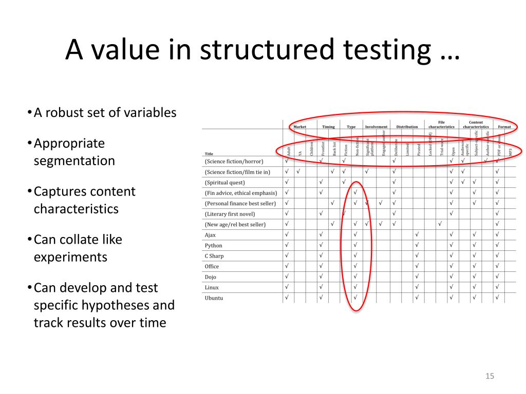 A value in structured testing … • A robust set of variables • Appropriate segmentation • Captures content characteristics • Can collate like experiments • Can develop and test specific hypotheses and track results over time