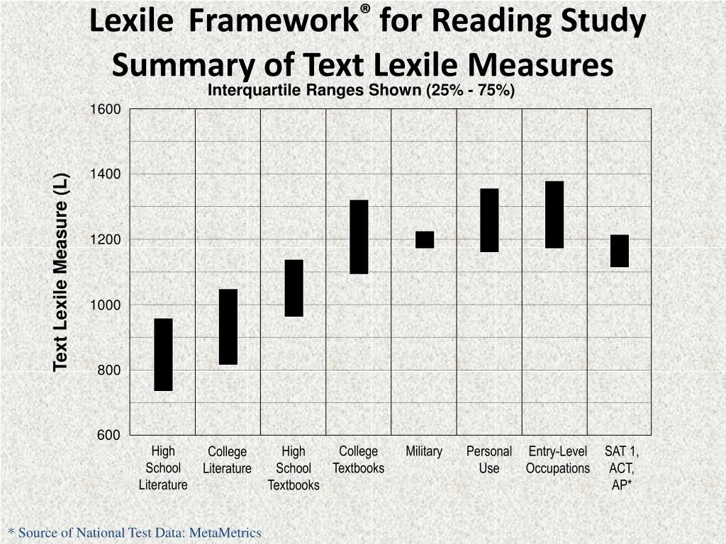 Interquartile Ranges Shown (25% - 75%) 1600 1400 Lexile Framework® for Reading Study Summary of Text Lexile Measures 1200 Text Lexile Measure (L) 1000 800 600 High School Literature College Textbooks Military High School Textbooks Personal Use Entry-Level Occupations SAT 1, ACT, AP* College Literature * Source of National Test Data: MetaMetrics
