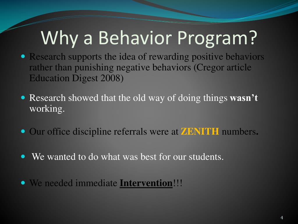 Why a Behavior Program? • Research supports the idea of rewarding positive behaviors rather than punishing negative behaviors (Cregor article Education Digest 2008) • Research showed that the old way of doing things wasn’t working. • Our office discipline referrals were atZENITHnumbers. • We wanted to do what was best for our students. • We needed immediate Intervention!!!