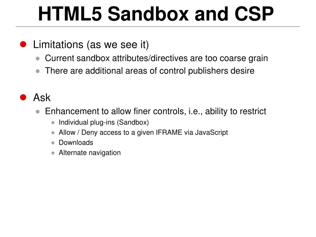HTML5 Sandbox and CSP • Limitations (as we see it) • Current sandbox attributes/directives are too coarse grain • There are additional areas of control publishers desire • Ask • Enhancement to allow finer controls, i.e., ability to restrict • Individual plug-ins (Sandbox) • Allow / Deny access to a given IFRAME via JavaScript • Downloads • Alternate navigation