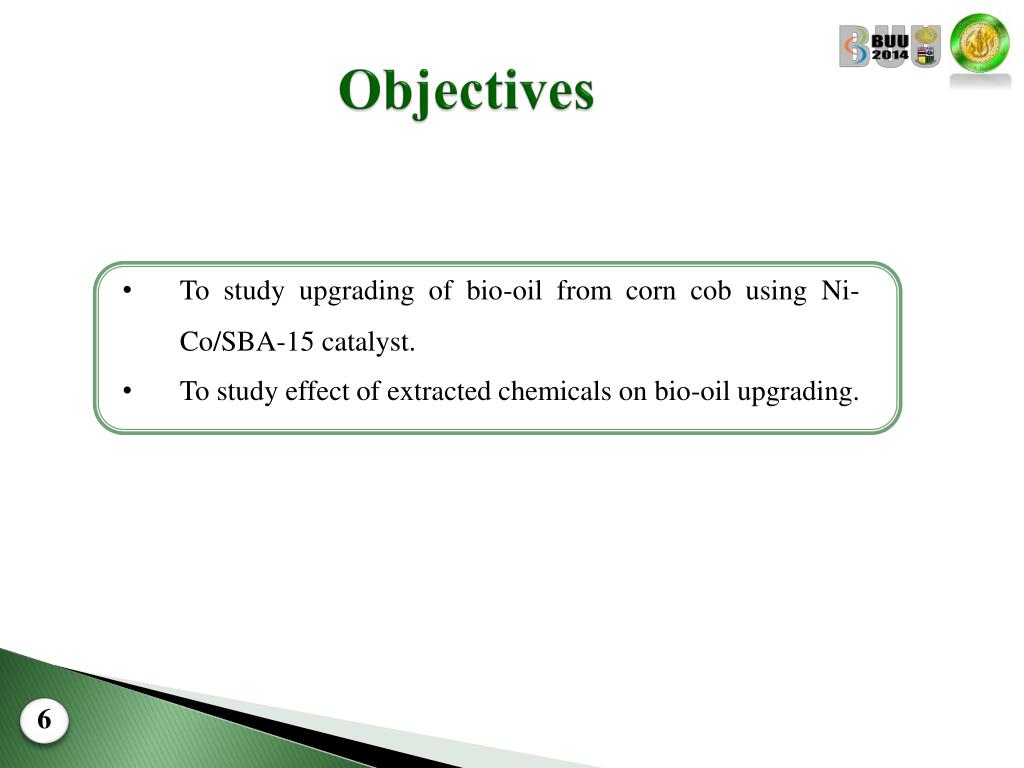 Objectives • To study upgrading of bio-oil from corn cob using Ni-Co/SBA-15 catalyst. • To study effect of extracted chemicals on bio-oil upgrading. 6