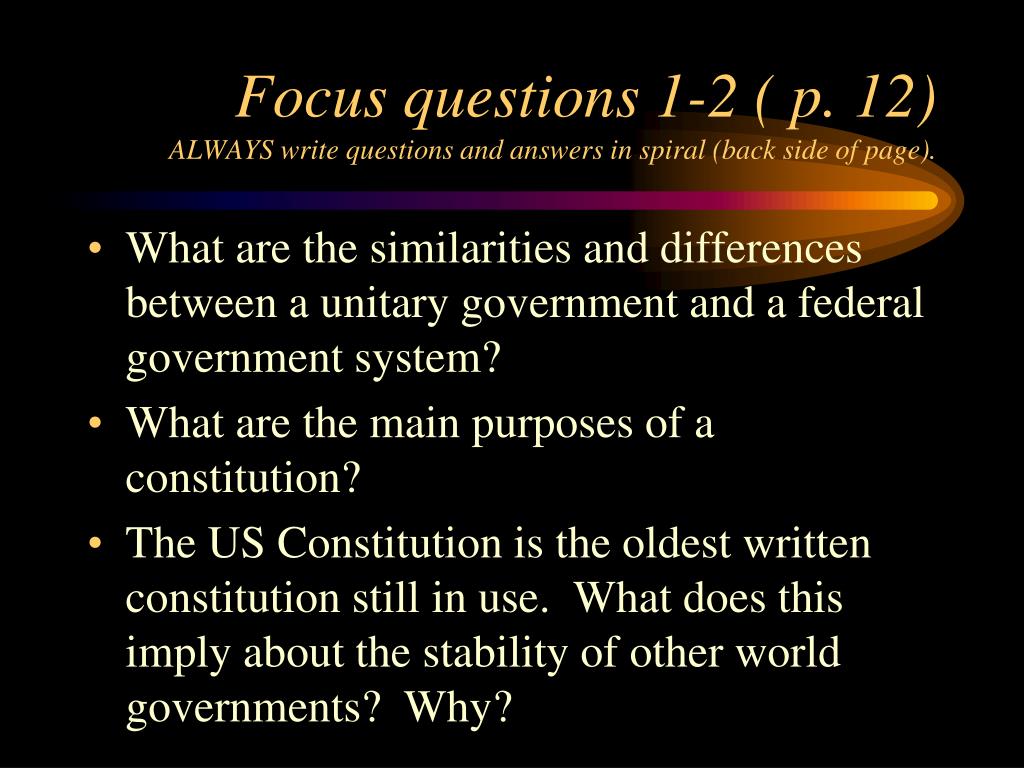 Focus questions 1-2 ( p. 12)ALWAYS write questions and answers in spiral (back side of page). • What are the similarities and differences between a unitary government and a federal government system? • What are the main purposes of a constitution? • The US Constitution is the oldest written constitution still in use. What does this imply about the stability of other world governments? Why?