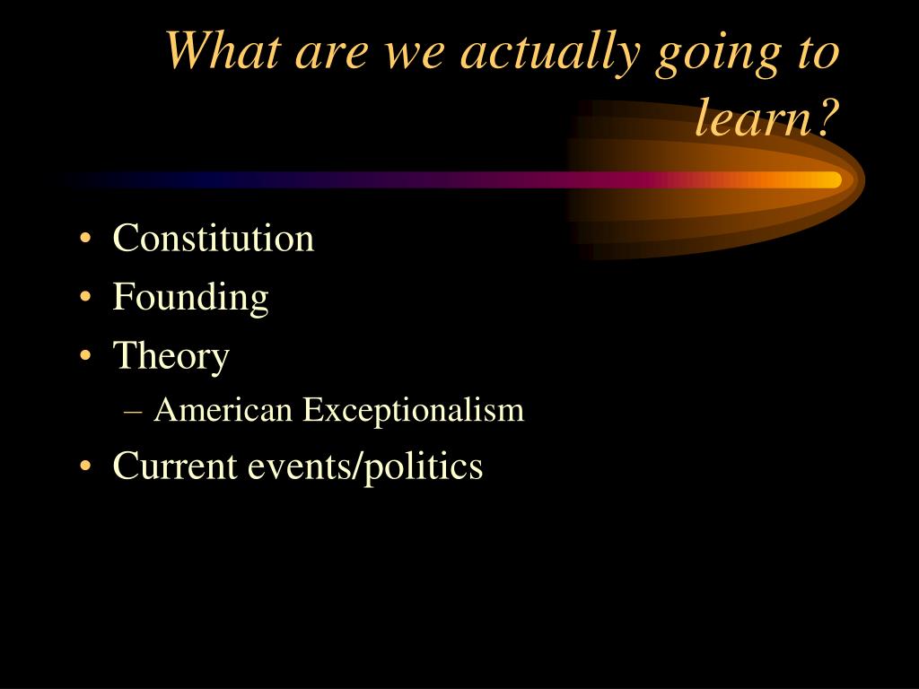 What are we actually going to learn? • Constitution • Founding • Theory • American Exceptionalism • Current events/politics