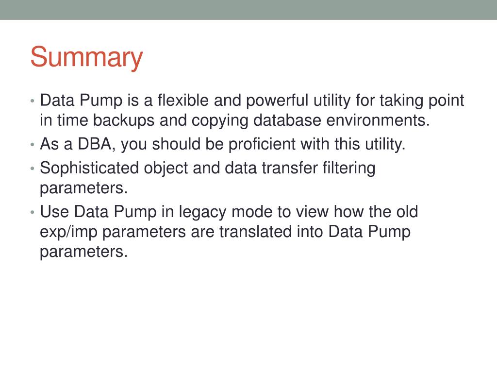 Summary • Data Pump is a flexible and powerful utility for taking point in time backups and copying database environments. • As a DBA, you should be proficient with this utility. • Sophisticated object and data transfer filtering parameters. • Use Data Pump in legacy mode to view how the old exp/imp parameters are translated into Data Pump parameters.