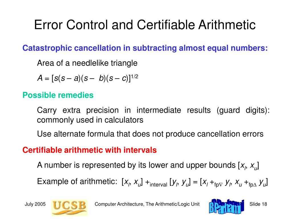Error Control and Certifiable Arithmetic Catastrophic cancellation in subtracting almost equal numbers: Area of a needlelike triangle A = [s(s – a)(s – b)(s – c)]1/2 Possible remedies Carry extra precision in intermediate results (guard digits): commonly used in calculators Use alternate formula that does not produce cancellation errors Certifiable arithmetic with intervals A number is represented by its lower and upper bounds [xl, xu] Example of arithmetic: [xl, xu] +interval [yl, yu] = [xl +fpyl, xu +fpyu] Computer Architecture, The Arithmetic/Logic Unit