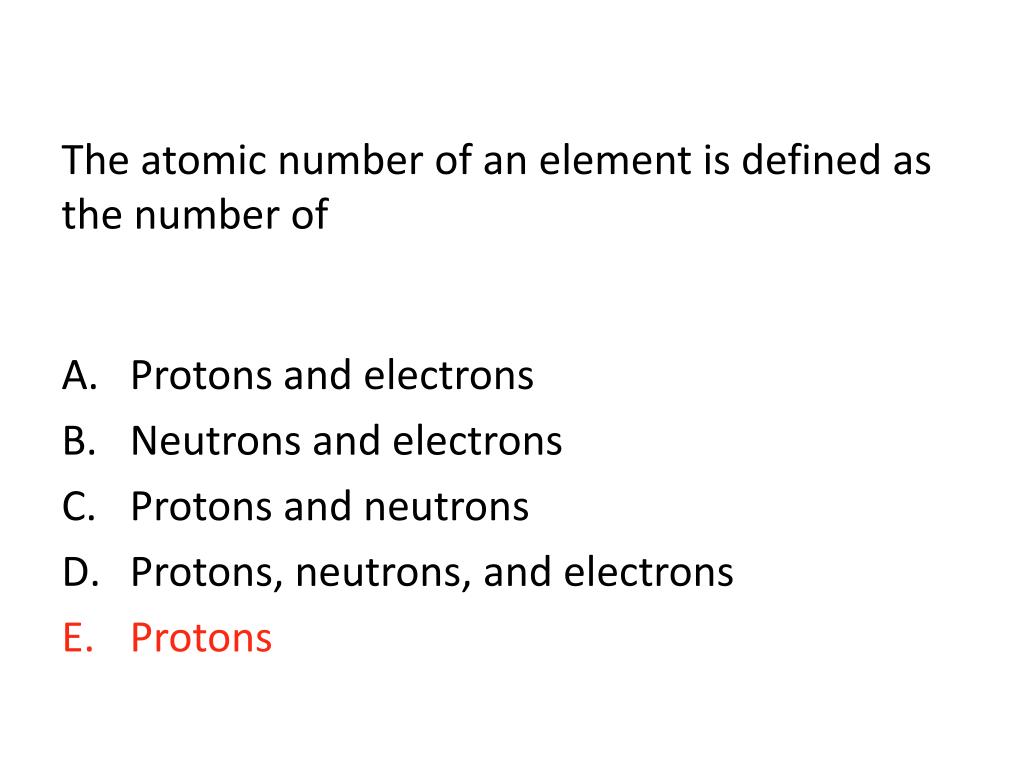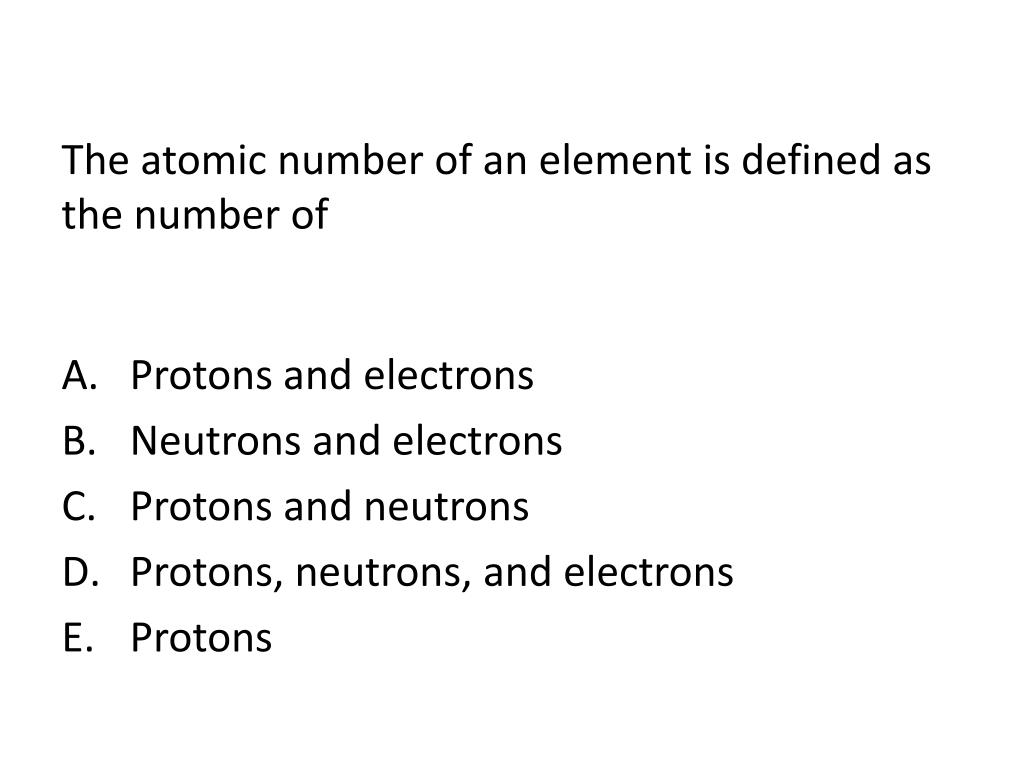 The atomic number of an element is defined as the number of • Protons and electrons • Neutrons and electrons • Protons and neutrons • Protons, neutrons, and electrons • Protons