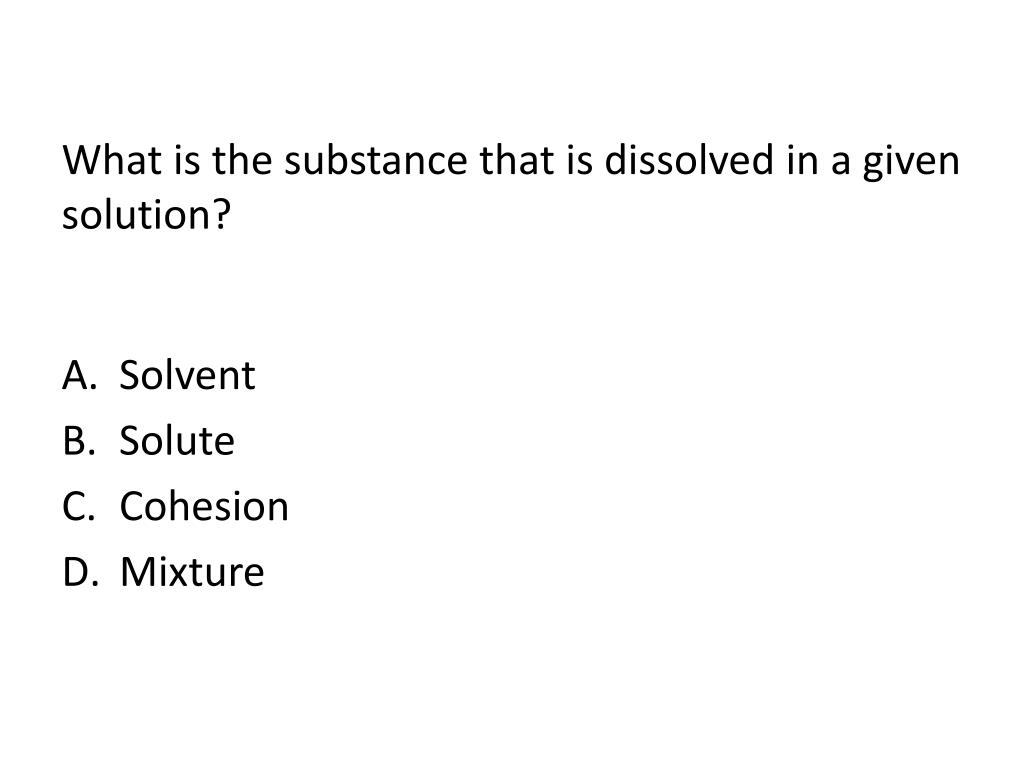 What is the substance that is dissolved in a given solution? Solvent Solute Cohesion Mixture