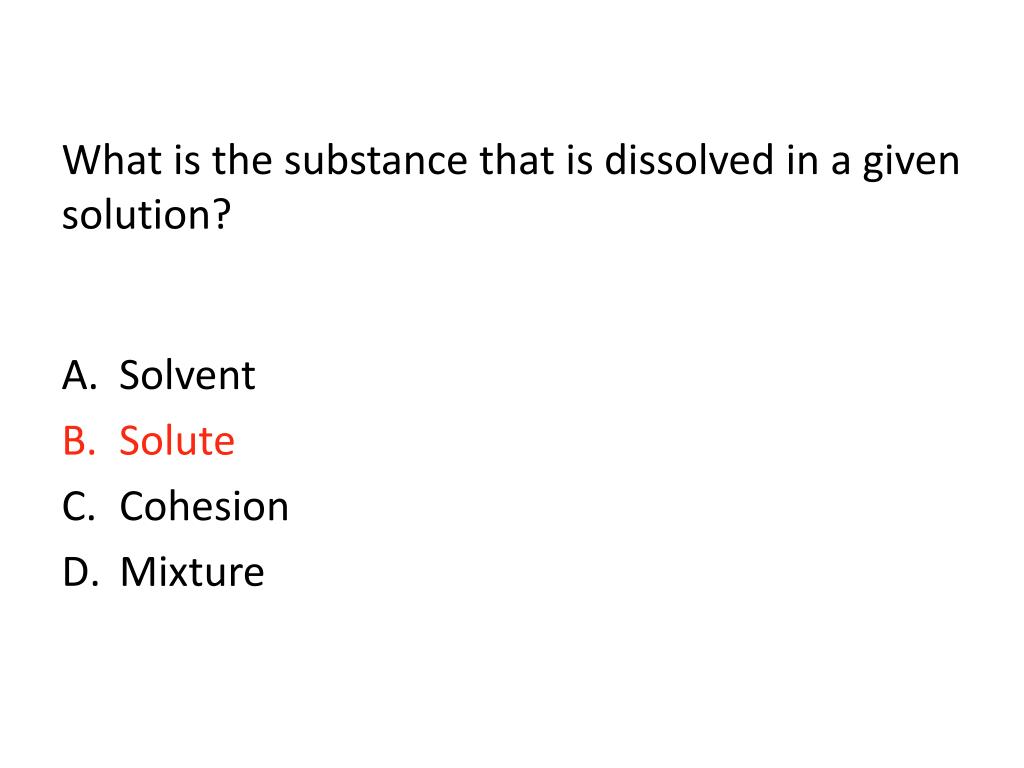 What is the substance that is dissolved in a given solution? • Solvent • Solute • Cohesion • Mixture