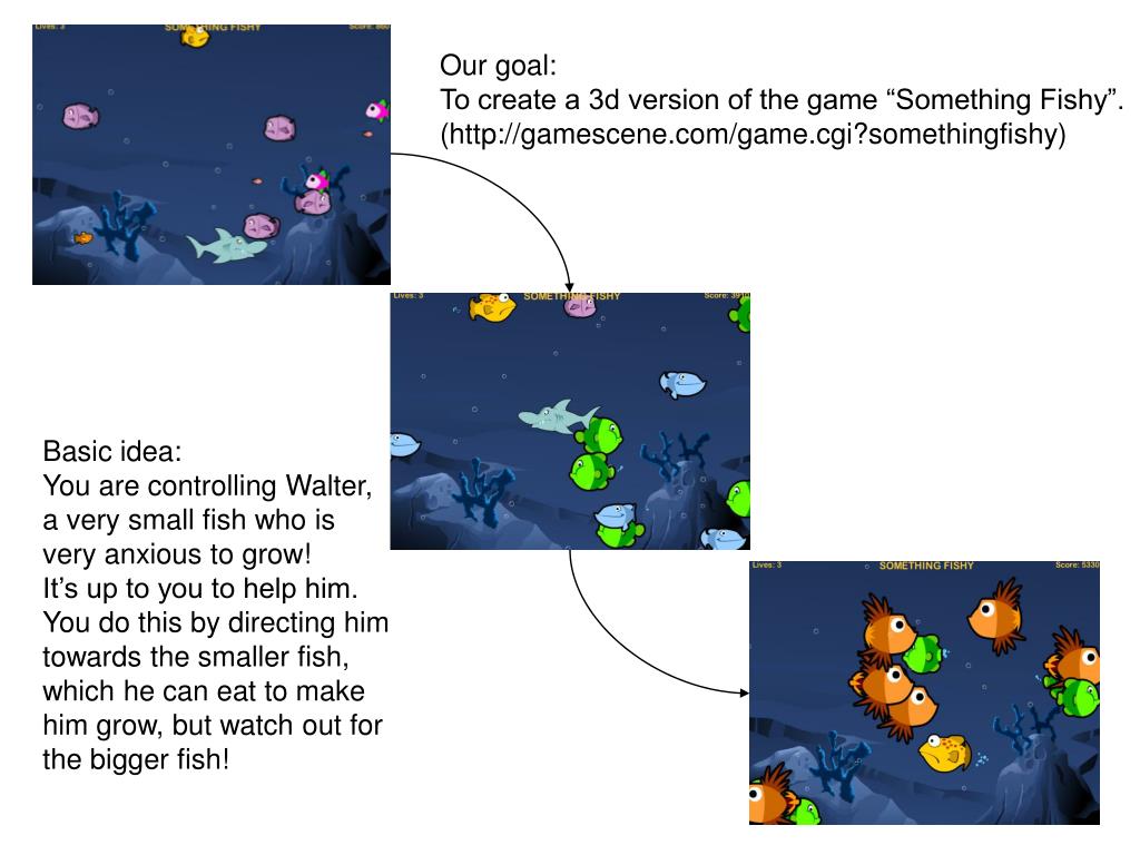 “Something Fishy”. Ricardo Tangali & Niels Rietkerk. Our goal: To create a 3d version of the game “Something Fishy”. (http://gamescene.com/game.cgi?somethingfishy). Basic idea: You are controlling Walter, a very small fish who is very anxious to grow! It’s up to you to help him.