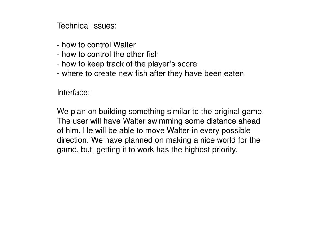 Technical issues: • how to control Walter • how to control the other fish • how to keep track of the player’s score • where to create new fish after they have been eaten • Interface: • We plan on building something similar to the original game. • The user will have Walter swimming some distance ahead • of him. He will be able to move Walter in every possible • direction. We have planned on making a nice world for the • game, but, getting it to work has the highest priority.