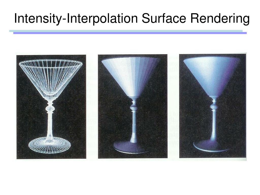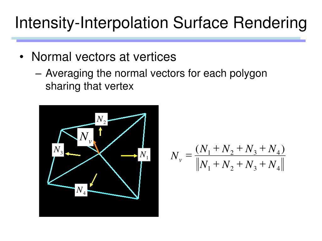 + + + ( N N N N ) = 1 2 3 4 N v + + + N N N N 1 2 3 4 Intensity-Interpolation Surface Rendering • Normal vectors at vertices • Averaging the normal vectors for each polygon sharing that vertex