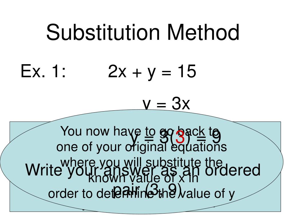 SYSTEMS OF EQUATIONS. Substitution Method. Ex. 1: 2x + y = 15 y = 3x. You now have to go back to one of your original equations where you will substitute the known value of x in order to determine the value of y. We have been using the Substitution Property in our proofs.