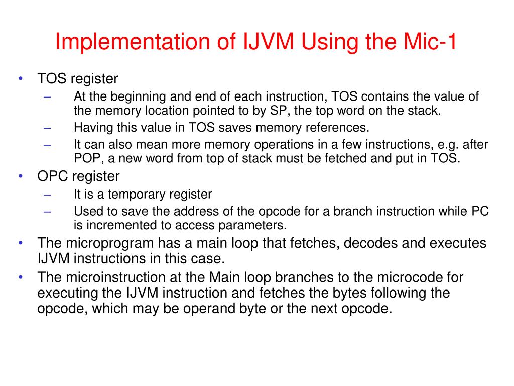 The Microarchitecture Level. Chapter 4. Implementation of IJVM Using the Mic-1. TOS register At the beginning and end of each instruction, TOS contains the value of the memory location pointed to by SP, the top word on the stack. Having this value in TOS saves memory references.