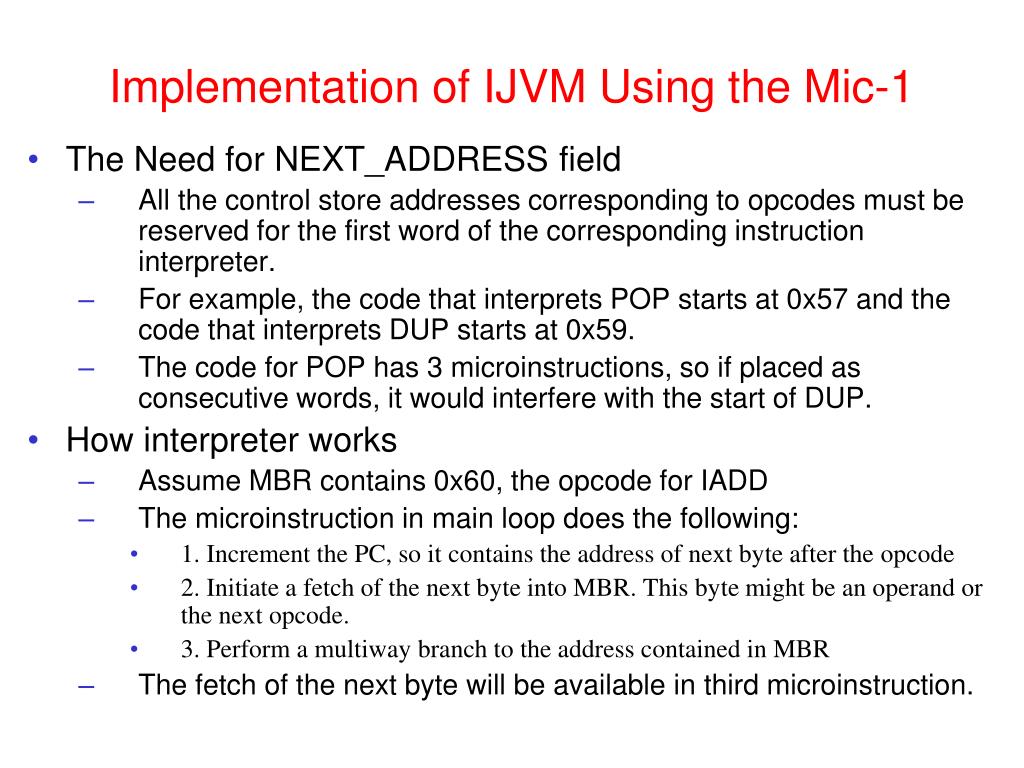 Implementation of IJVM Using the Mic-1 • The Need for NEXT_ADDRESS field • All the control store addresses corresponding to opcodes must be reserved for the first word of the corresponding instruction interpreter. • For example, the code that interprets POP starts at 0x57 and the code that interprets DUP starts at 0x59. • The code for POP has 3 microinstructions, so if placed as consecutive words, it would interfere with the start of DUP. • How interpreter works • Assume MBR contains 0x60, the opcode for IADD • The microinstruction in main loop does the following: • 1. Increment the PC, so it contains the address of next byte after the opcode • 2. Initiate a fetch of the next byte into MBR. This byte might be an operand or the next opcode. • 3. Perform a multiway branch to the address contained in MBR • The fetch of the next byte will be available in third microinstruction.