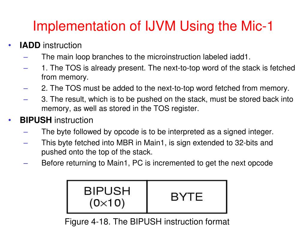 Implementation of IJVM Using the Mic-1 • IADD instruction • The main loop branches to the microinstruction labeled iadd1. • 1. The TOS is already present. The next-to-top word of the stack is fetched from memory. • 2. The TOS must be added to the next-to-top word fetched from memory. • 3. The result, which is to be pushed on the stack, must be stored back into memory, as well as stored in the TOS register. • BIPUSH instruction • The byte followed by opcode is to be interpreted as a signed integer. • This byte fetched into MBR in Main1, is sign extended to 32-bits and pushed onto the top of the stack. • Before returning to Main1, PC is incremented to get the next opcode • Figure 4-18. The BIPUSH instruction format