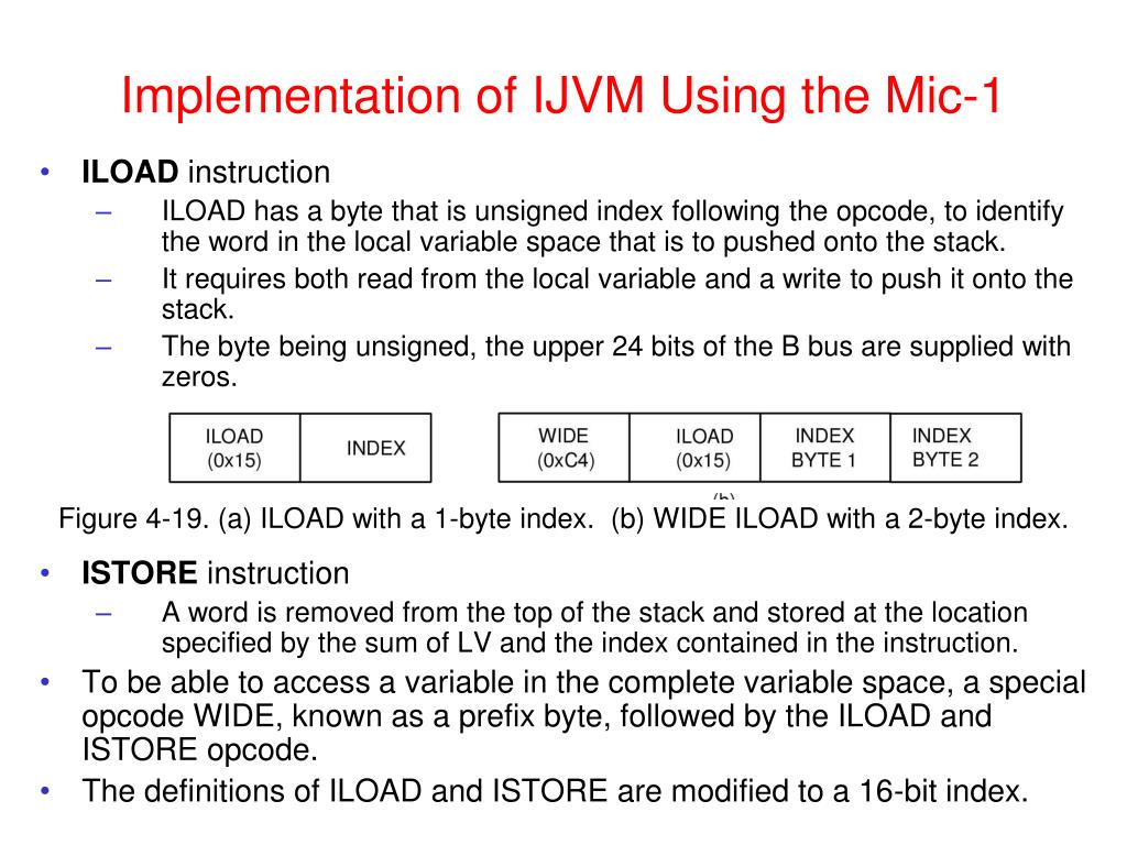 Implementation of IJVM Using the Mic-1 • Figure 4-19. (a) ILOAD with a 1-byte index. (b) WIDE ILOAD with a 2-byte index. • ILOAD instruction • ILOAD has a byte that is unsigned index following the opcode, to identify the word in the local variable space that is to pushed onto the stack. • It requires both read from the local variable and a write to push it onto the stack. • The byte being unsigned, the upper 24 bits of the B bus are supplied with zeros. • ISTOREinstruction • A word is removed from the top of the stack and stored at the location specified by the sum of LV and the index contained in the instruction. • To be able to access a variable in the complete variable space, a special opcode WIDE, known as a prefix byte, followed by the ILOAD and ISTORE opcode. • The definitions of ILOAD and ISTORE are modified to a 16-bit index.