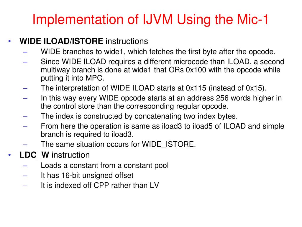 Implementation of IJVM Using the Mic-1 • WIDE ILOAD/ISTORE instructions • WIDE branches to wide1, which fetches the first byte after the opcode. • Since WIDE ILOAD requires a different microcode than ILOAD, a second multiway branch is done at wide1 that ORs 0x100 with the opcode while putting it into MPC. • The interpretation of WIDE ILOAD starts at 0x115 (instead of 0x15). • In this way every WIDE opcode starts at an address 256 words higher in the control store than the corresponding regular opcode. • The index is constructed by concatenating two index bytes. • From here the operation is same as iload3 to iload5 of ILOAD and simple branch is required to iload3. • The same situation occurs for WIDE_ISTORE. • LDC_W instruction • Loads a constant from a constant pool • It has 16-bit unsigned offset • It is indexed off CPP rather than LV