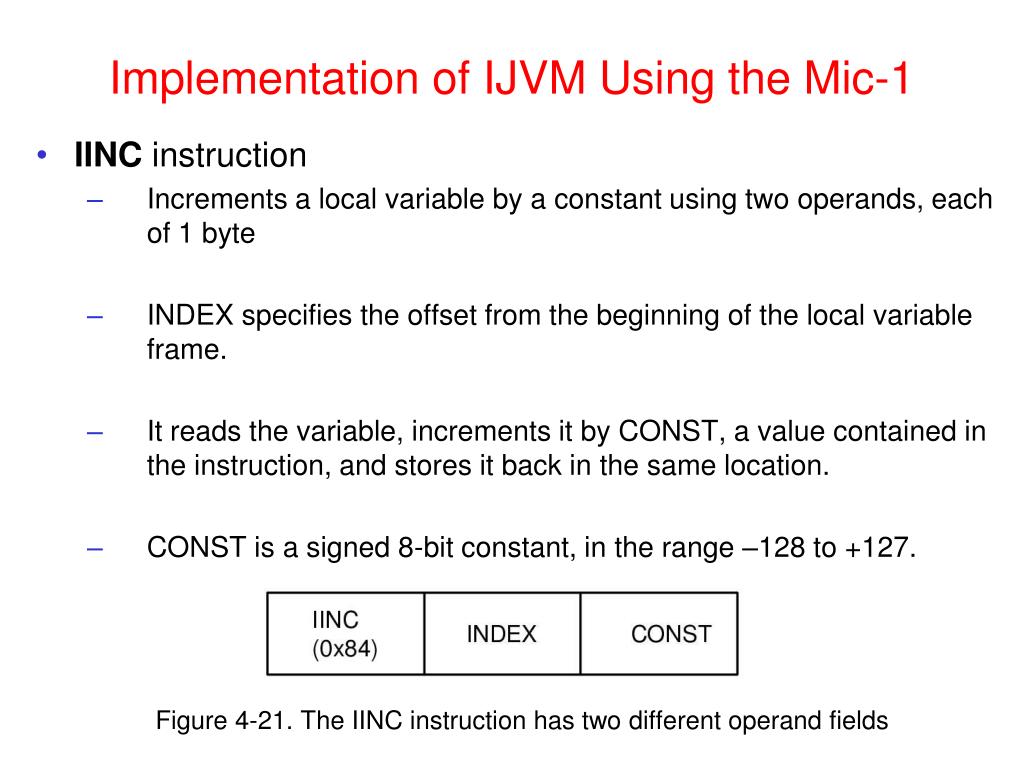 Implementation of IJVM Using the Mic-1 • IINC instruction • Increments a local variable by a constant using two operands, each of 1 byte • INDEX specifies the offset from the beginning of the local variable frame. • It reads the variable, increments it by CONST, a value contained in the instruction, and stores it back in the same location. • CONST is a signed 8-bit constant, in the range –128 to +127. • Figure 4-21. The IINC instruction has two different operand fields