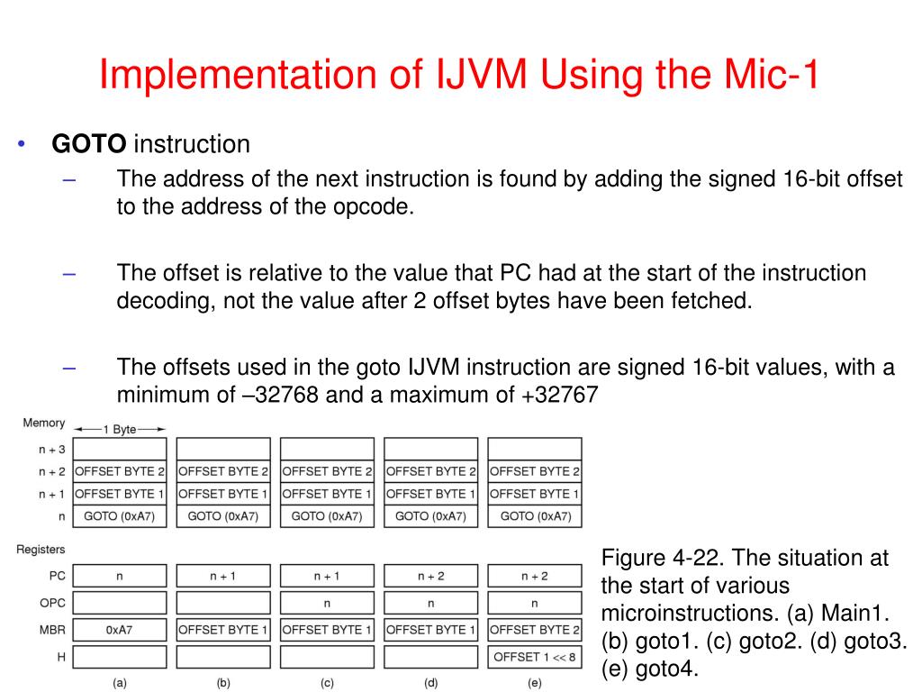 Implementation of IJVM Using the Mic-1 • Figure 4-22. The situation at the start of various microinstructions. (a) Main1. (b) goto1. (c) goto2. (d) goto3. (e) goto4. • GOTO instruction • The address of the next instruction is found by adding the signed 16-bit offset to the address of the opcode. • The offset is relative to the value that PC had at the start of the instruction decoding, not the value after 2 offset bytes have been fetched. • The offsets used in the goto IJVM instruction are signed 16-bit values, with a minimum of –32768 and a maximum of +32767