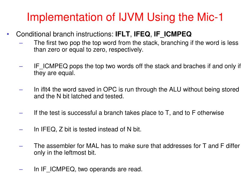 Implementation of IJVM Using the Mic-1 • Conditional branch instructions: IFLT, IFEQ, IF_ICMPEQ • The first two pop the top word from the stack, branching if the word is less than zero or equal to zero, respectively. • IF_ICMPEQ pops the top two words off the stack and braches if and only if they are equal. • In iflt4 the word saved in OPC is run through the ALU without being stored and the N bit latched and tested. • If the test is successful a branch takes place to T, and to F otherwise • In IFEQ, Z bit is tested instead of N bit. • The assembler for MAL has to make sure that addresses for T and F differ only in the leftmost bit. • In IF_ICMPEQ, two operands are read.