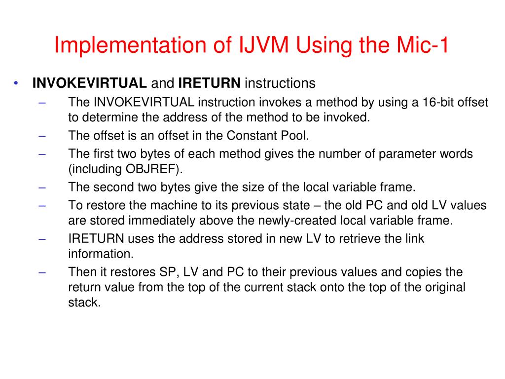 Implementation of IJVM Using the Mic-1 • INVOKEVIRTUAL and IRETURN instructions • The INVOKEVIRTUAL instruction invokes a method by using a 16-bit offset to determine the address of the method to be invoked. • The offset is an offset in the Constant Pool. • The first two bytes of each method gives the number of parameter words (including OBJREF). • The second two bytes give the size of the local variable frame. • To restore the machine to its previous state – the old PC and old LV values are stored immediately above the newly-created local variable frame. • IRETURN uses the address stored in new LV to retrieve the link information. • Then it restores SP, LV and PC to their previous values and copies the return value from the top of the current stack onto the top of the original stack.
