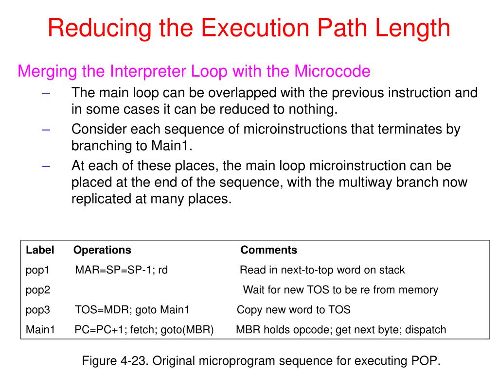 Reducing the Execution Path Length Label Operations Comments pop1 MAR=SP=SP-1; rd Read in next-to-top word on stack Main1.pop PC=PC+1; fetch MBR holds opcode; fetch next byte pop3 TOS=MDR; goto(MBR) Copy new word to TOS; dispatch on opcode • In the figure below, the sequence has been reduced to three instructions by merging the main loop instructions. • The end of the sequence branches directly to the specific code for the subsequent instruction. • This trick reduces the execution time of the next microinstruction by one cycle. • It is equivalent to speeding the clock from 250 MHz (4 nsec microinstructions) to 333 MHz (3 nsec microinstructions) for free. • Figure 4-24. Enhanced microprogram sequence for executing POP