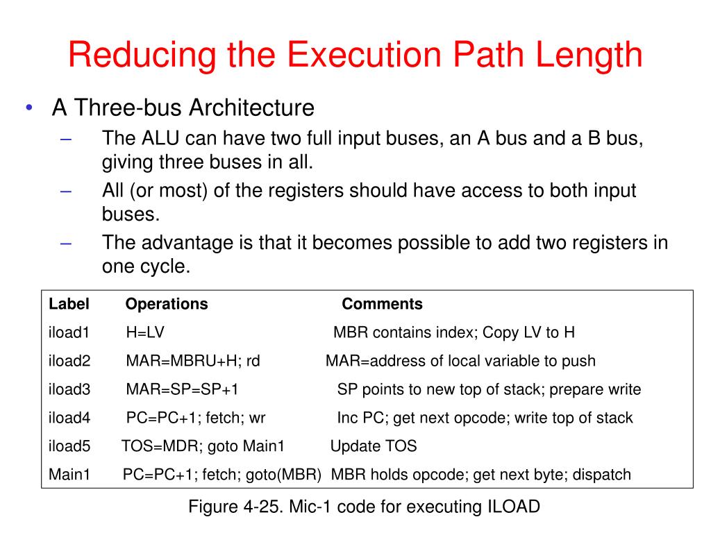 Reducing the Execution Path Length Label Operations Comments iload1 H=LV MBR contains index; Copy LV to H iload2 MAR=MBRU+H; rdMAR=address of local variable to push iload3 MAR=SP=SP+1 SP points to new top of stack; prepare write iload4 PC=PC+1; fetch; wr Inc PC; get next opcode; write top of stack iload5 TOS=MDR; goto Main1 Update TOS Main1 PC=PC+1; fetch; goto(MBR) MBR holds opcode; get next byte; dispatch • A Three-bus Architecture • The ALU can have two full input buses, an A bus and a B bus, giving three buses in all. • All (or most) of the registers should have access to both input buses. • The advantage is that it becomes possible to add two registers in one cycle. • Figure 4-25. Mic-1 code for executing ILOAD
