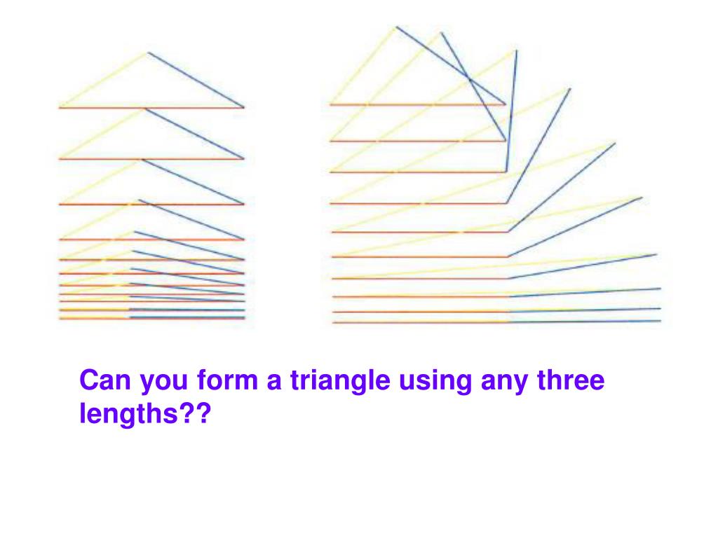 Triangle Inequality Conjecture The sum of the lengths of any two sides of a triangle is __________ the length of the third side. Ex 1: Which of the following segments could form a triangle? A. 6, 8, 10 B. 3, 3, 3 C. 2, 3, 5 D. 8, 2, 9 E. 10, 3, 4 F. 1, 1, 2