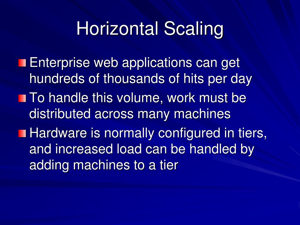 Horizontal Scaling • Enterprise web applications can get hundreds of thousands of hits per day • To handle this volume, work must be distributed across many machines • Hardware is normally configured in tiers, and increased load can be handled by adding machines to a tier