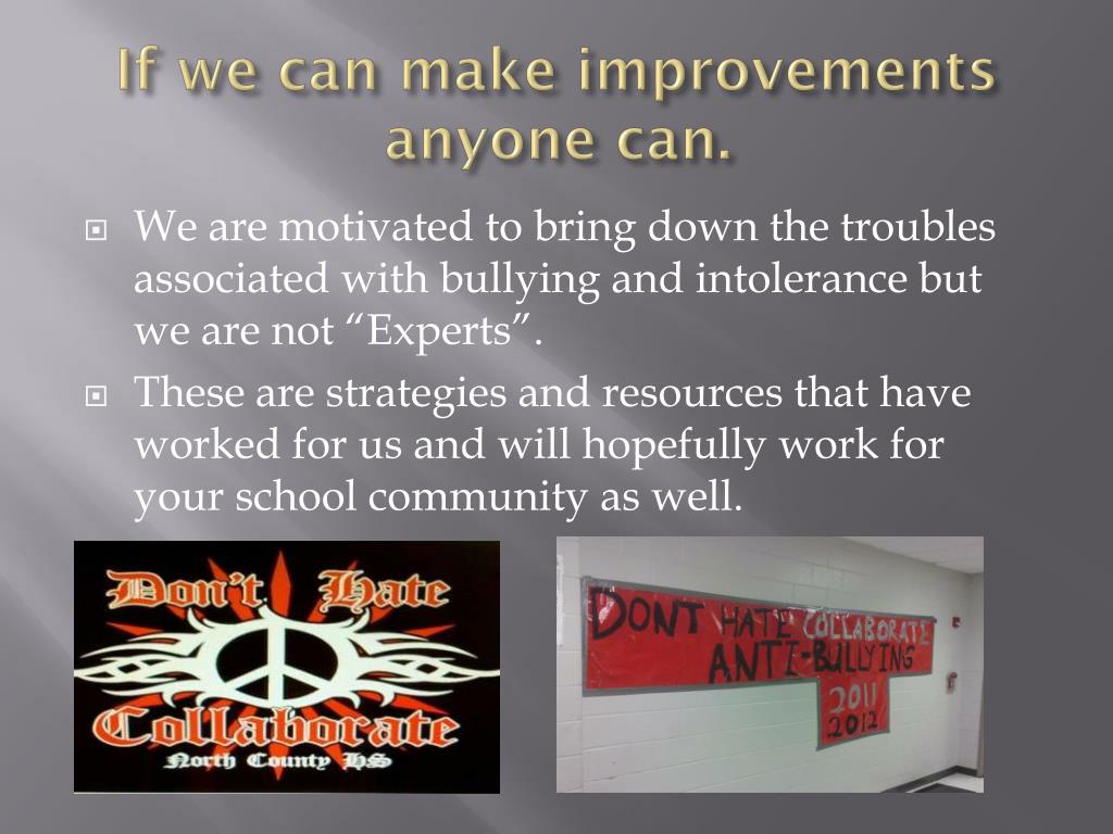 If we can make improvements anyone can. • We are motivated to bring down the troubles associated with bullying and intolerance but we are not “Experts”. • These are strategies and resources that have worked for us and will hopefully work for your school community as well.
