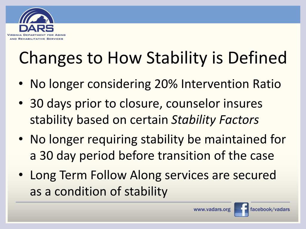 Changes to How Stability is Defined • No longer considering 20% Intervention Ratio • 30 days prior to closure, counselor insures stability based on certain Stability Factors • No longer requiring stability be maintained for a 30 day period before transition of the case • Long Term Follow Along services are secured as a condition of stability