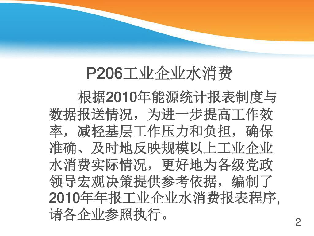 P206 工业企业用水情况表程序及报表审核( 2010 年年报). 广州市白云区统计局 2010 年 12 月. P206 工业企业水消费. 根据 2010 年能源统计报表制度与数据报送情况,为进一步提高工作效率,减轻基层工作压力和负担,确保准确、及时地反映规模以上工业企业水消费实际情况,更好地为各级党政领导宏观决策提供参考依据,编制了 2010 年年报工业企业水消费报表程序 , 请各企业参照执行。. 一、报表说明. (一)调查企业的确定.