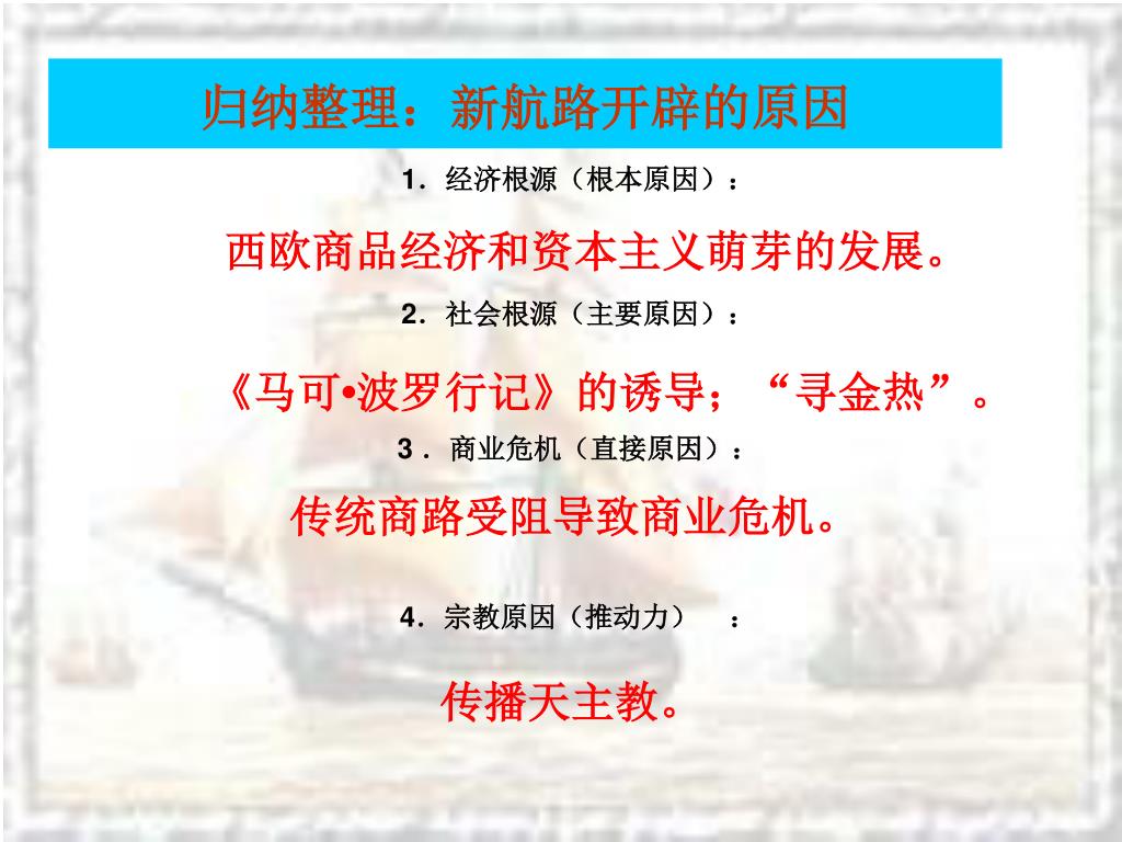 归纳整理:新航路开辟的条件 1.造船技术的进步 2.航海技术的进步 3.地理知识的进步 4.西班牙和葡萄牙王室的支持