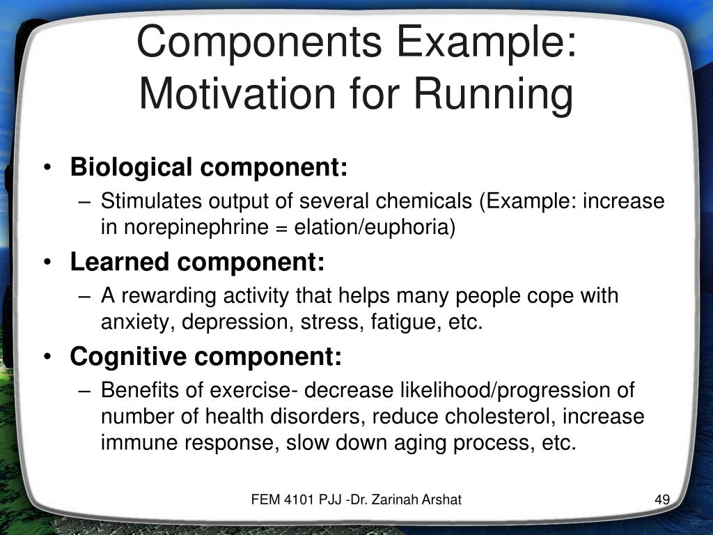 Components Example:Motivation for Running • Biological component: • Stimulates output of several chemicals (Example: increase in norepinephrine = elation/euphoria) • Learned component: • A rewarding activity that helps many people cope with anxiety, depression, stress, fatigue, etc. • Cognitive component: • Benefits of exercise- decrease likelihood/progression of number of health disorders, reduce cholesterol, increase immune response, slow down aging process, etc. FEM 4101 PJJ -Dr. Zarinah Arshat