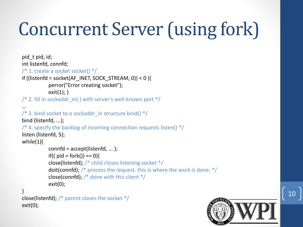 Concurrent Server (using fork) pid_tpid, id; intlistenfd, connfd; /* 1. create a socket socket() */ if ((listenfd = socket(AF_INET, SOCK_STREAM, 0)) < 0 ){ perror("Error creating socket"); exit(1); } /* 2. fill in sockaddr_in{ } with server's well-known port */ … /* 3. bind socket to a sockaddr_in structure bind() */ bind (listenfd, ...); /* 4. specify the backlog of incoming connection requests listen() */ listen (listenfd, 5); while(1){ connfd= accept(listenfd, ... ); if(( pid = fork()) == 0){ close(listenfd); /* child closes listening socket */ doit(connfd); /* process the request. this is where the work is done. */ close(connfd); /* done with this client */ exit(0); } close(listenfd); /* parent closes the socket */ exit(0);