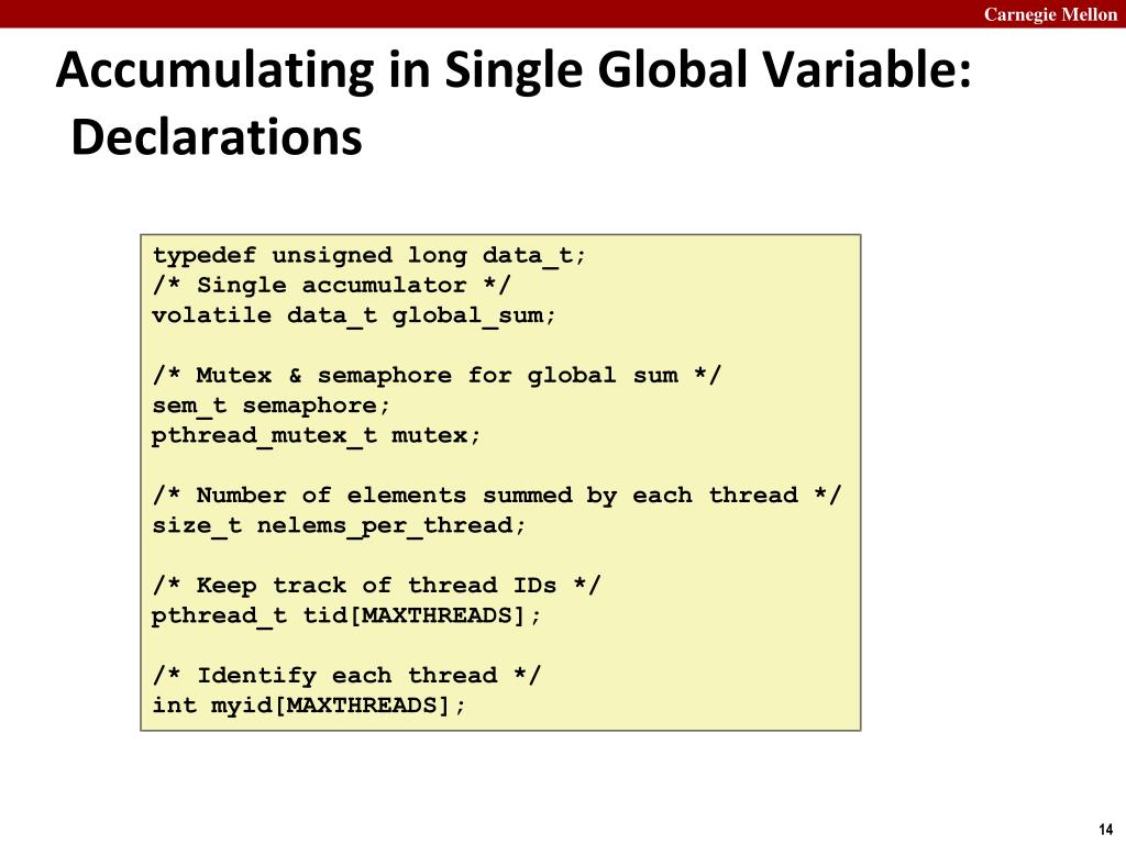Accumulating in Single Global Variable: Declarations typedef unsigned long data_t; /* Single accumulator */ volatile data_tglobal_sum; /* Mutex & semaphore for global sum */ sem_t semaphore; pthread_mutex_tmutex; /* Number of elements summed by each thread */ size_tnelems_per_thread; /* Keep track of thread IDs */ pthread_ttid[MAXTHREADS]; /* Identify each thread */ intmyid[MAXTHREADS];