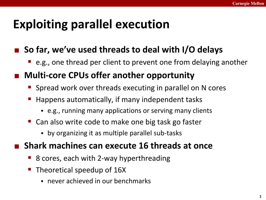 Exploiting parallel execution • So far, we’ve used threads to deal with I/O delays • e.g., one thread per client to prevent one from delaying another • Multi-core CPUs offer another opportunity • Spread work over threads executing in parallel on N cores • Happens automatically, if many independent tasks • e.g., running many applications or serving many clients • Can also write code to make one big task go faster • by organizing it as multiple parallel sub-tasks • Shark machines can execute 16 threads at once • 8 cores, each with 2-way hyperthreading • Theoretical speedup of 16X • never achieved in our benchmarks